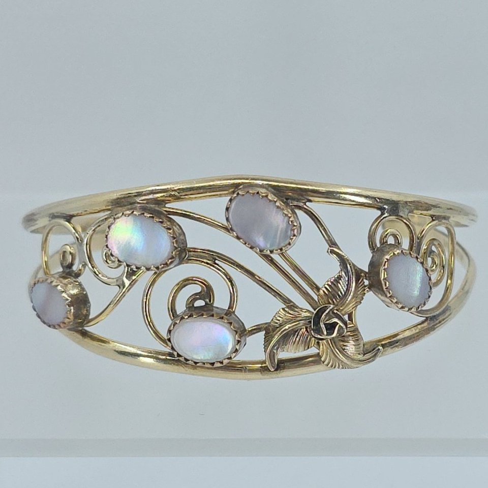 Adorn your wrist with this exquisite 12K gold filled cuff bracelet, elegantly decorated with five stunning mother of pearl stones. Weighs 12g, perfect for adding a touch of sophistication to any outfit.