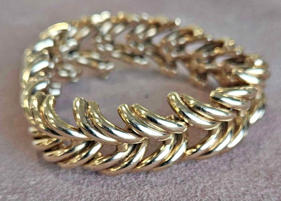 Luxurious 14K gold chevron link bracelet with a secure clasp and safety chain, weighing 35.5 grams.