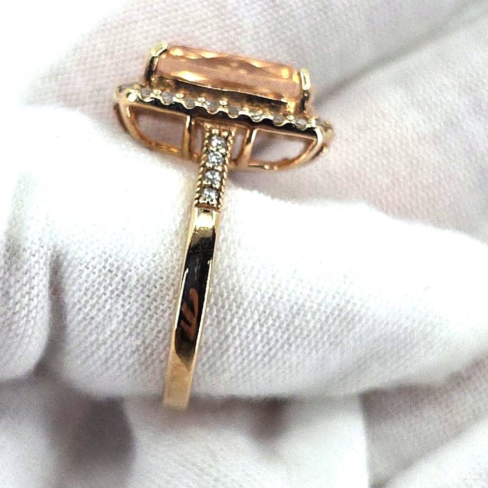 Add a touch of elegance to your collection with this stunning rose gold over sterling silver morganite ring. Featuring a shimmering halo of cubic zirconia, this size 9 ring is both striking and stylish. The radiant morganite gemstone, measuring 1.5cm x 1cm, beautifully contrasts with the warm tones of the setting, making it a captivating choice for any occasion.