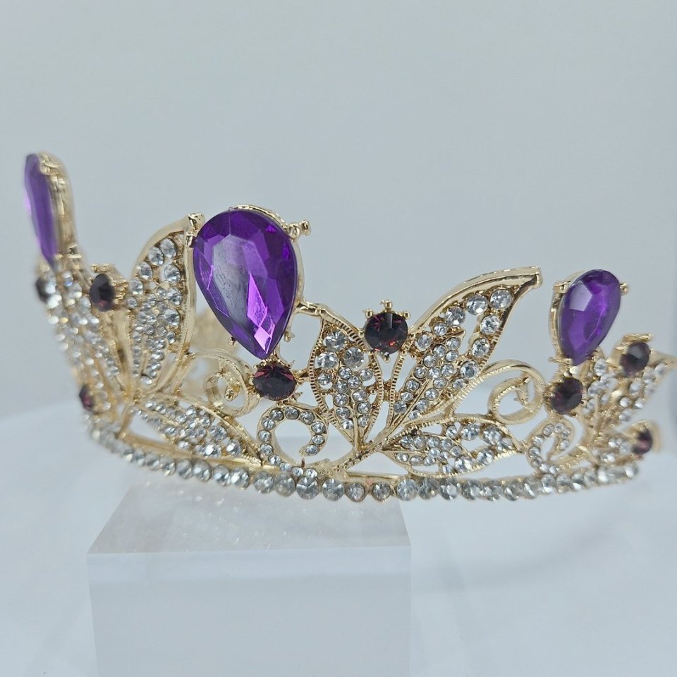 Get the Golden Purple and White Crown Tiara from Tazzy’s Treasures! Elevate any outfit with this exquisite, sparkling tiara fit for a queen. Make a statement and support animal welfare with every purchase.