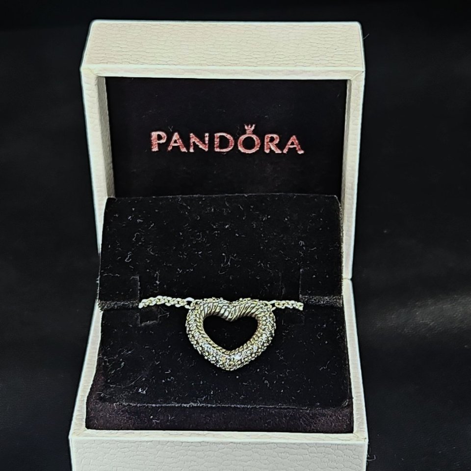 Pave snake chain pattern open heart necklace, adjustable up to 18 inches. Will come win original Pandora jewelry box.