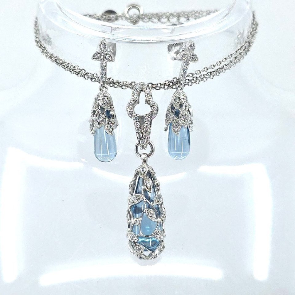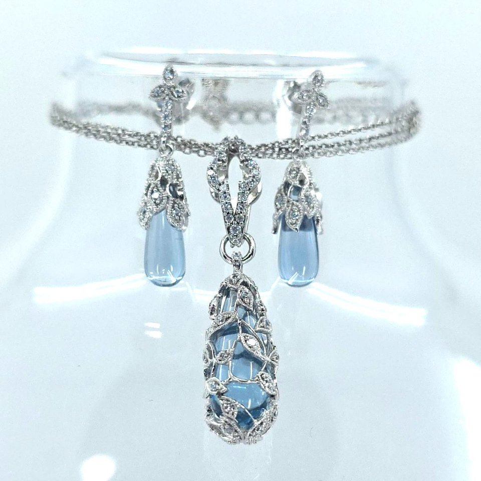 Elevate your elegance with the Stauer blue topaz and CZ teardrop pendant necklace and earrings set. The exquisite design features an adjustable 18 + 2 inches necklace, perfect for weddings or special occasions. Beautifully packaged in the original Stauer jewelry box, this set is the ideal gift for a loved one or a stunning addition to your collection.