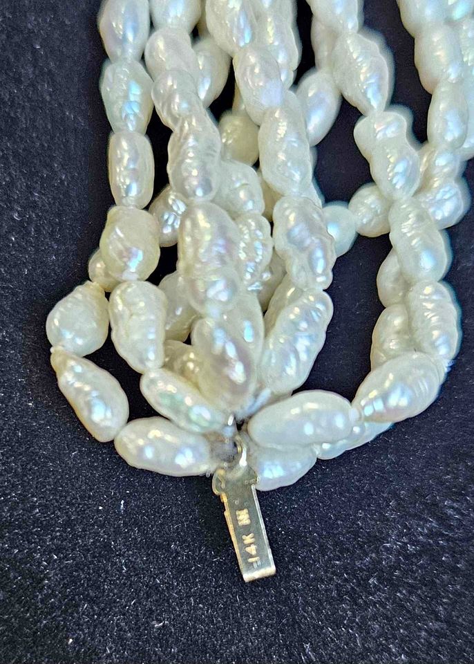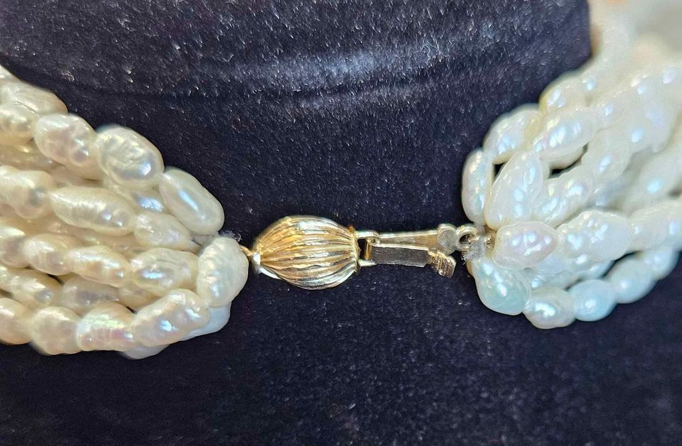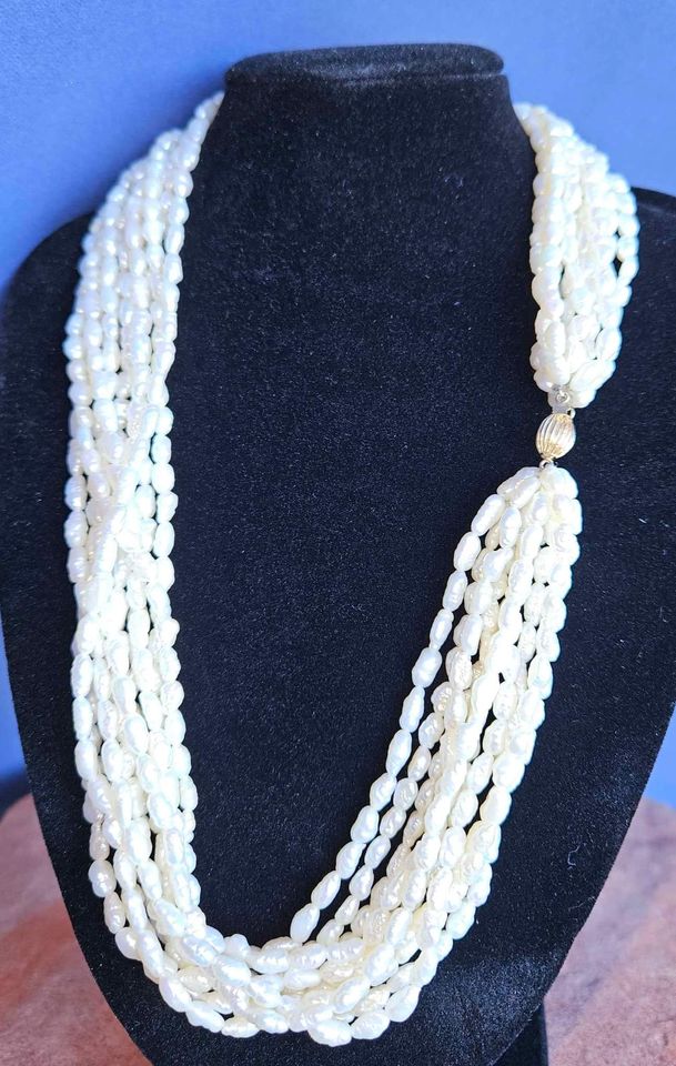 Elevate your style with this luxurious 10-strand freshwater pearl necklace, complete with a 14k yellow gold clasp. The lustrous pearls and intricate clasp design make this piece a true masterpiece. Measuring 18 inches, it’s perfect for adding sophistication to any occasion.