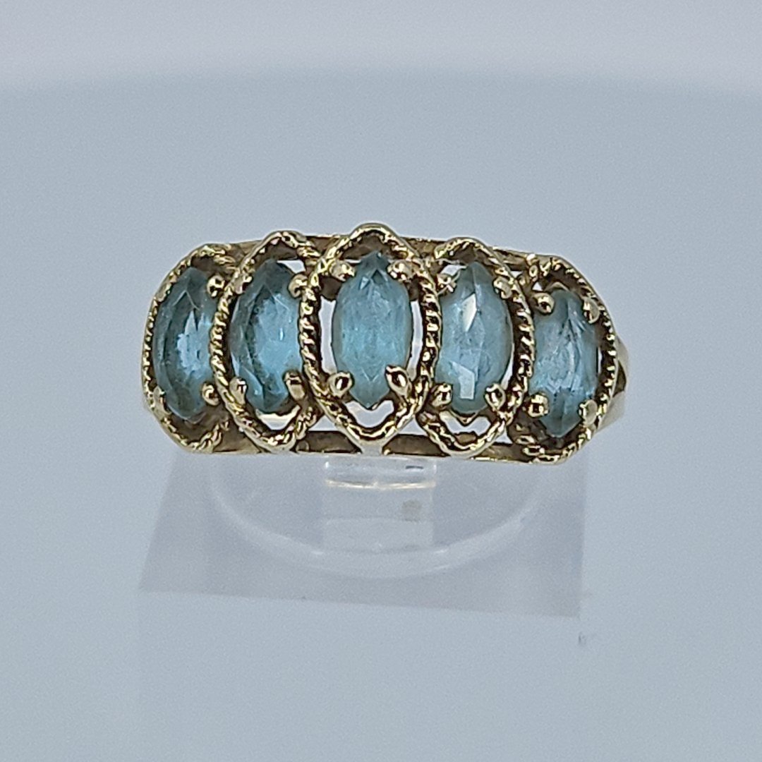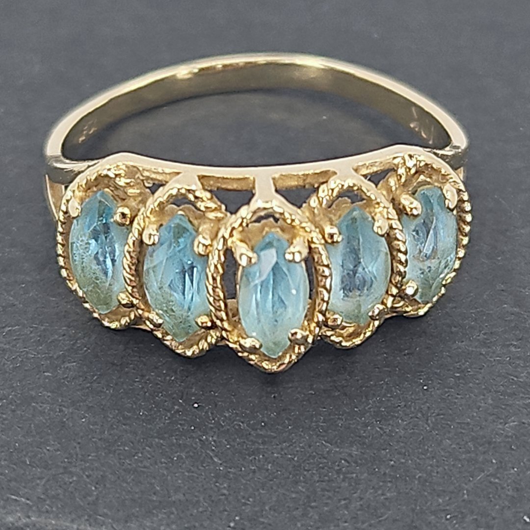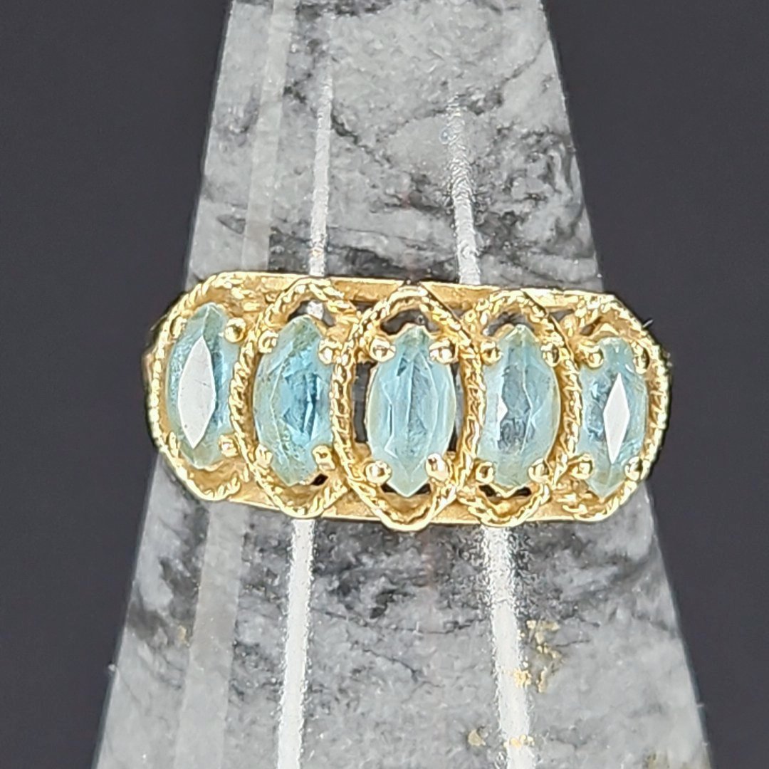 Crafted with 10K yellow gold, this ring features a tiered design with 5 marquise-cut blue topaz stones, exuding a sense of sophistication and refinement. The vibrant blue hues of the topaz stones are reminiscent of clear blue skies, adding a touch of tranquility to the piece.