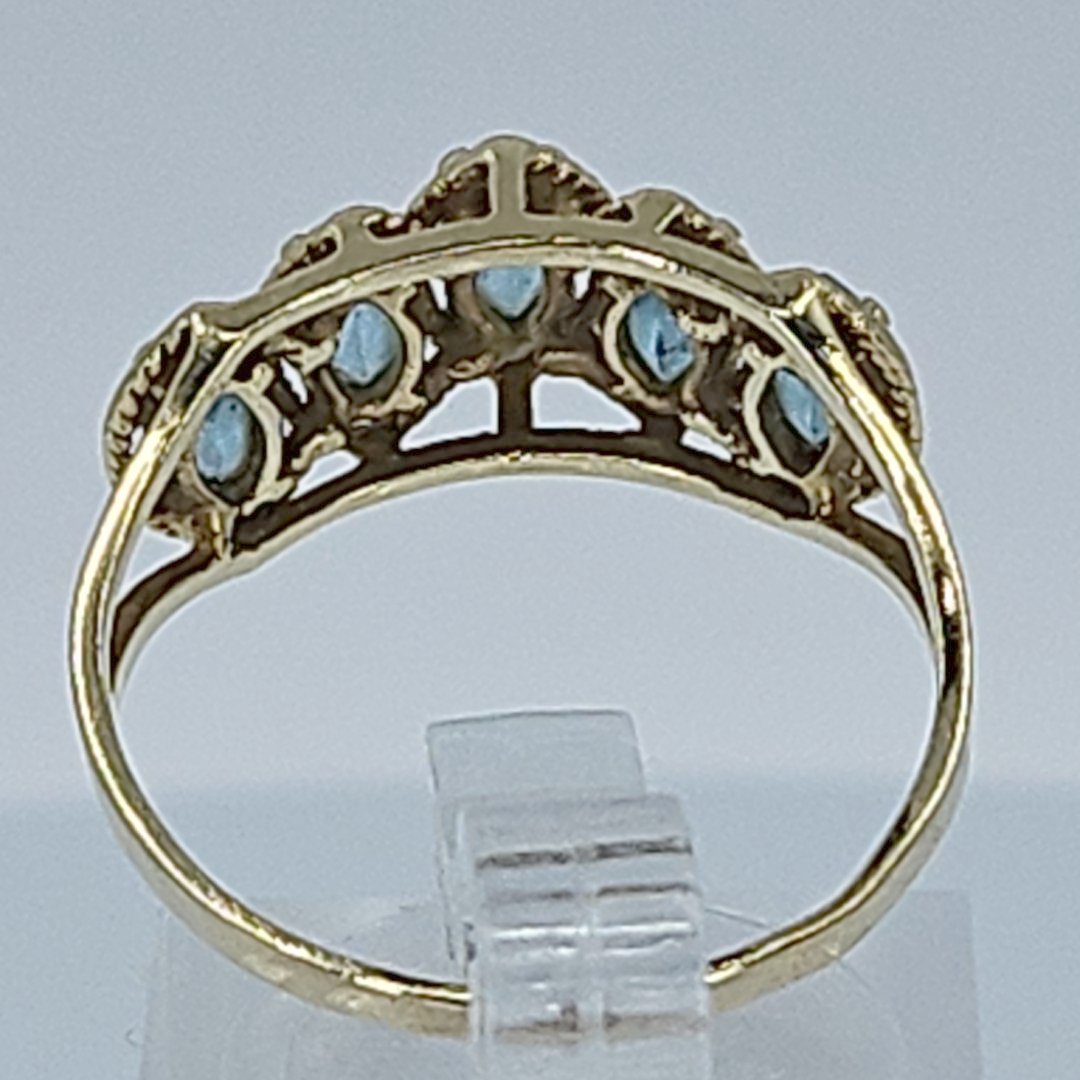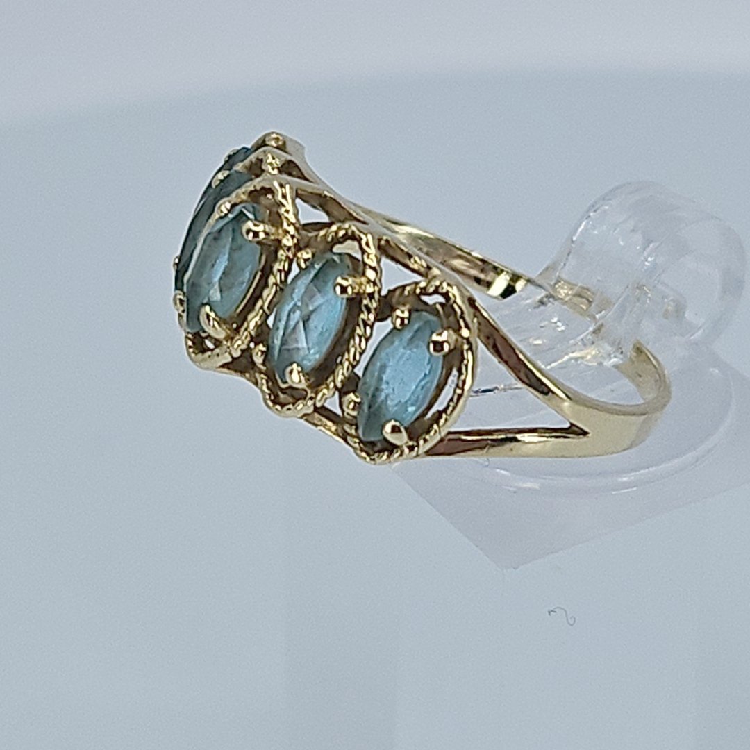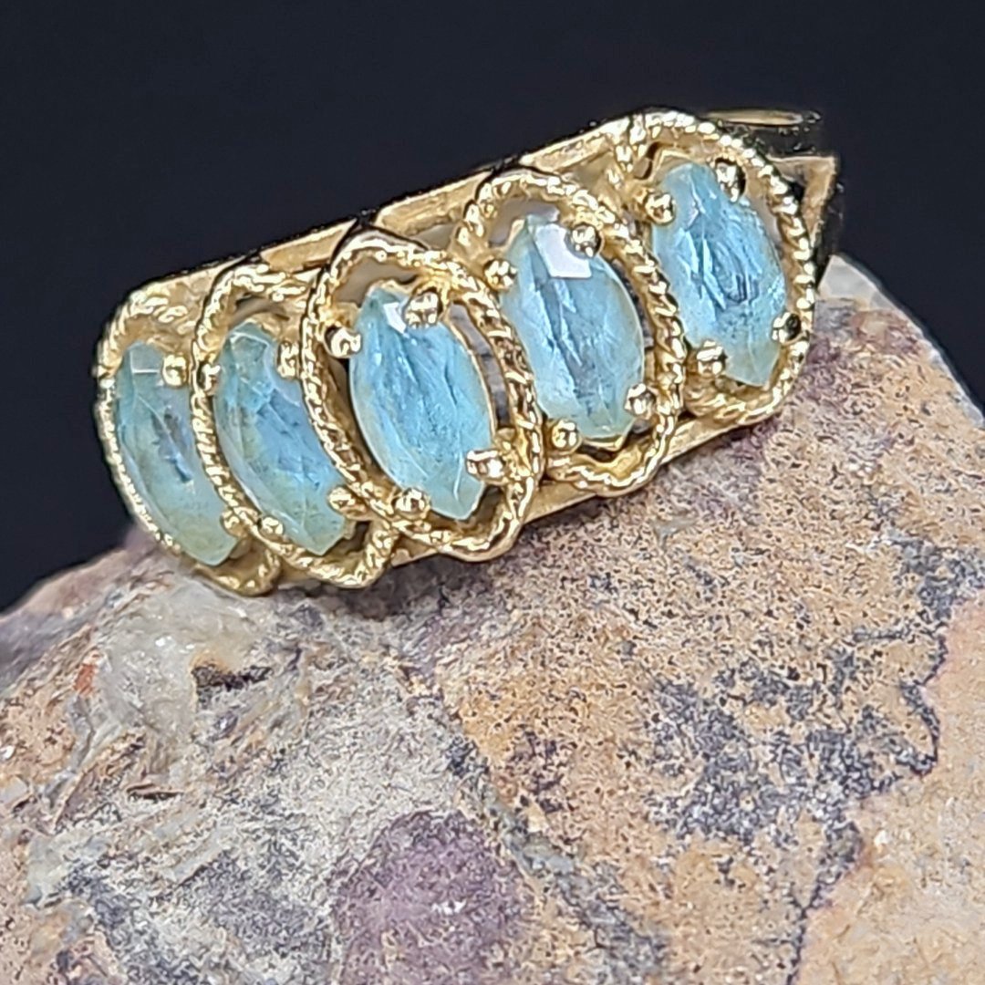Crafted with 10K yellow gold, this ring features a tiered design with 5 marquise-cut blue topaz stones, exuding a sense of sophistication and refinement. The vibrant blue hues of the topaz stones are reminiscent of clear blue skies, adding a touch of tranquility to the piece.