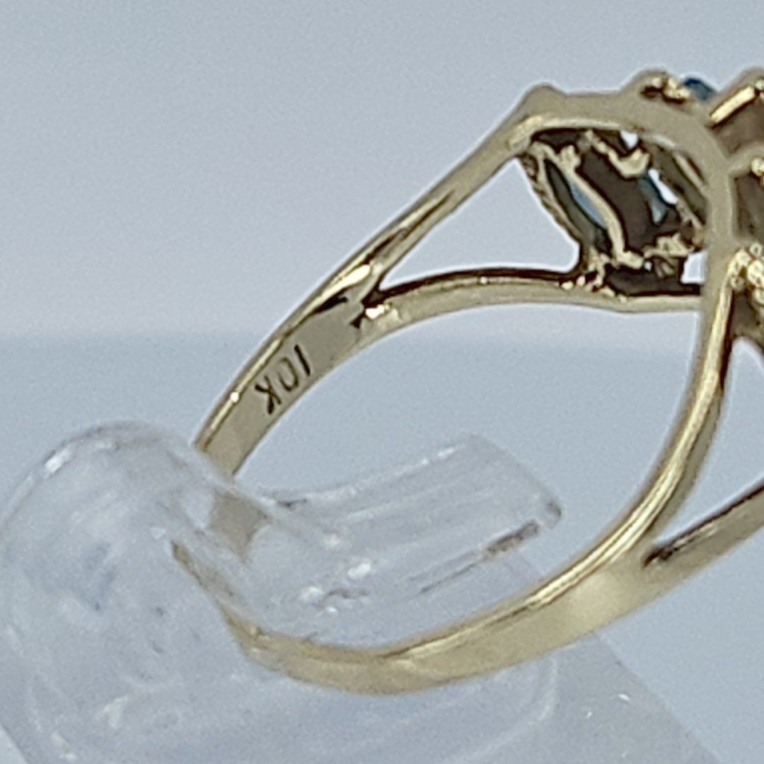 Welcome to Tazzy’s Treasures, where elegance meets compassion. Introducing our stunning 10K Yellow Gold Marquise Tiered Blue Topaz Ring, a true statement piece that captures the essence of timeless beauty.