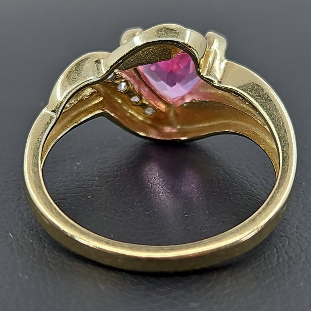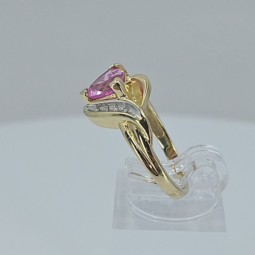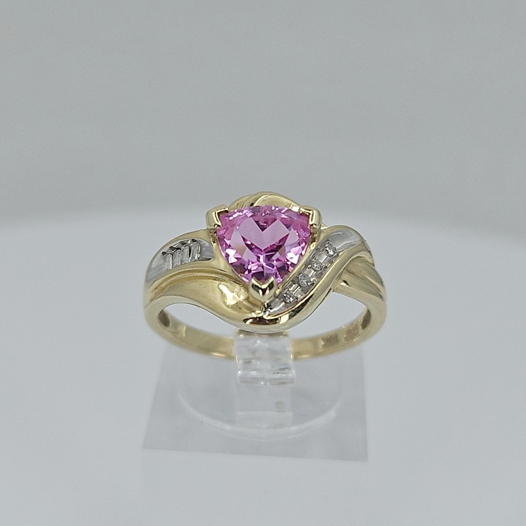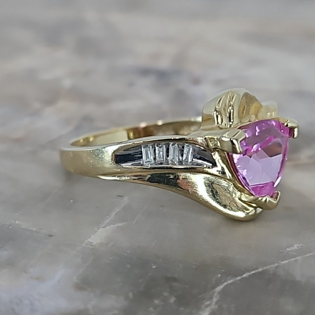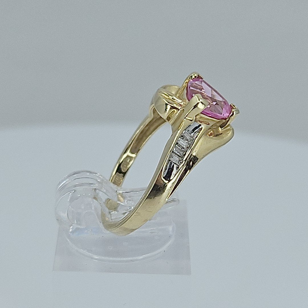 Stunning! This ring features a radiant pink sapphire set in 10K gold, complemented by delicate side details and round and baguette cut diamonds. Its design combines traditional charm with modern elegance, making it a standout addition to any collection. Perfect for special occasions or as a cherished gift.