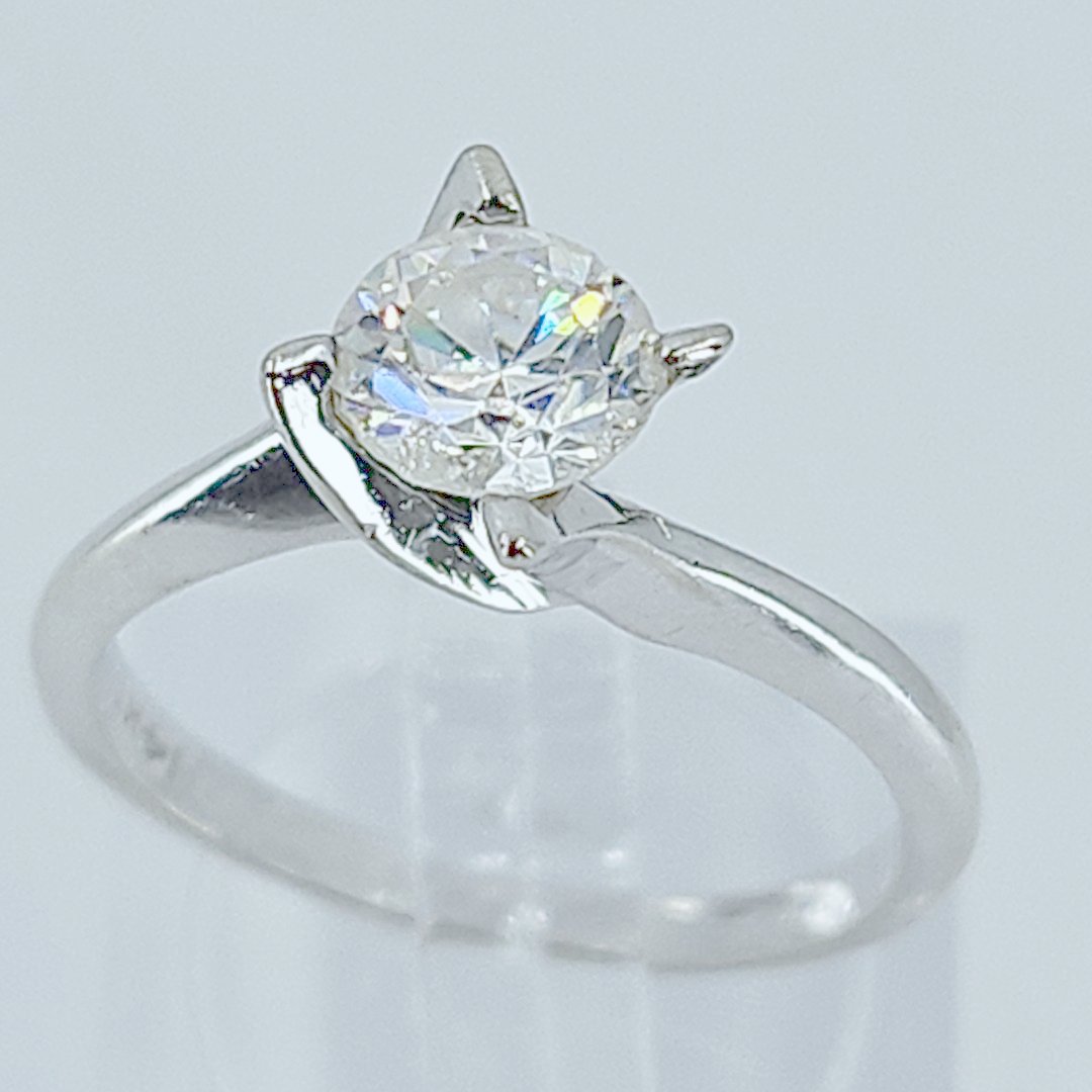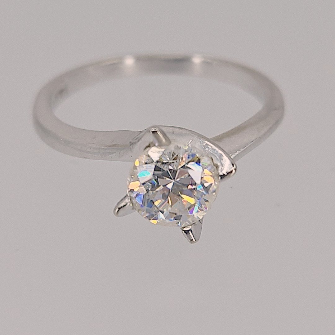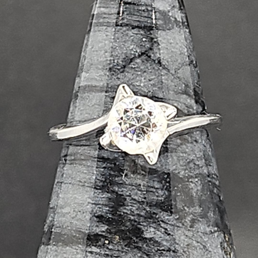 This beautiful ring features a sophisticated 14k white gold band, adorned with a striking white quartz gemstone. The gem is in a solitaire setting. The ring shows a maker’s mark of ’14k S’, verifying its authenticity and quality craftsmanship.