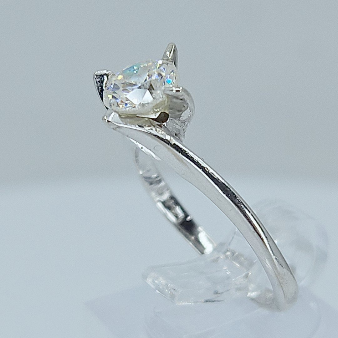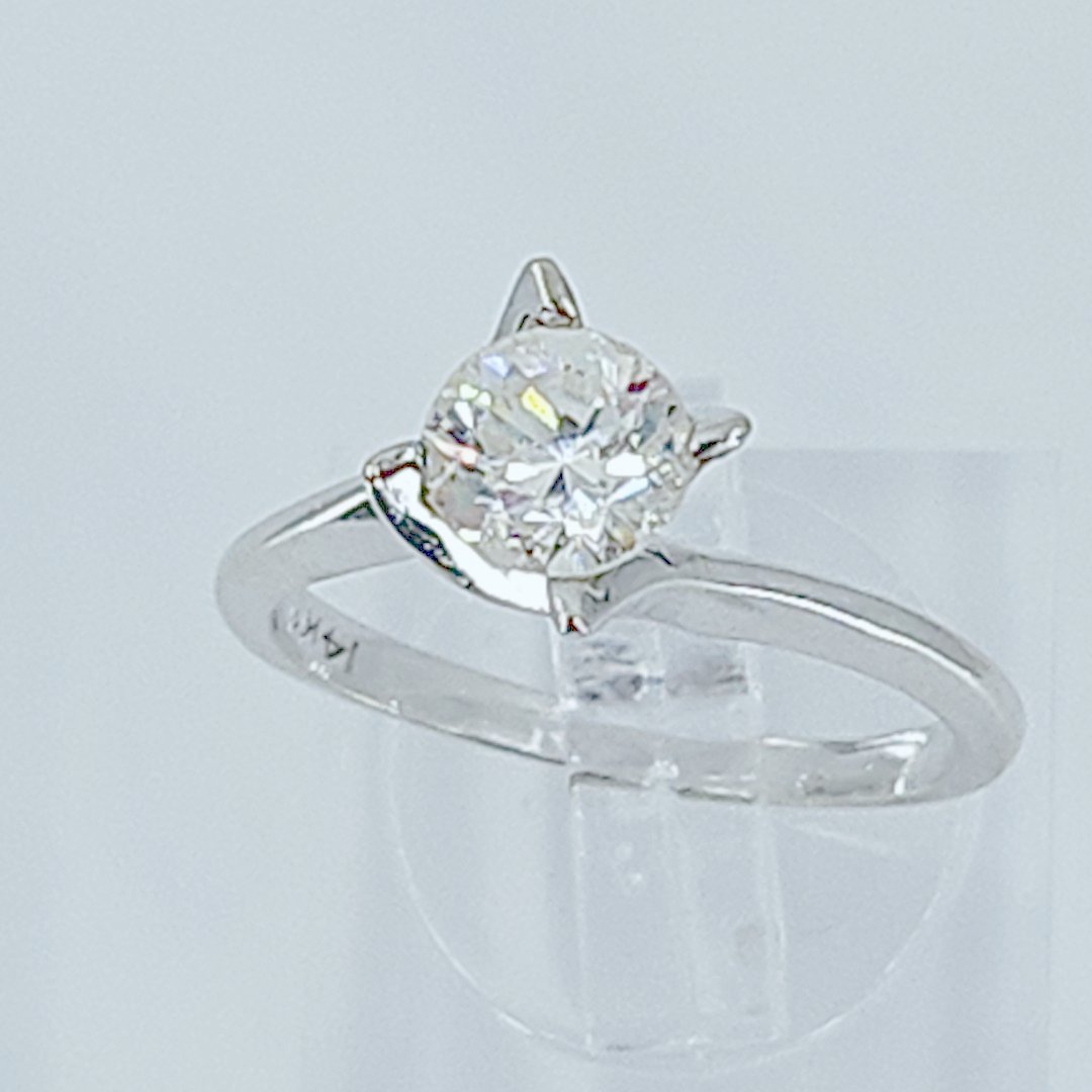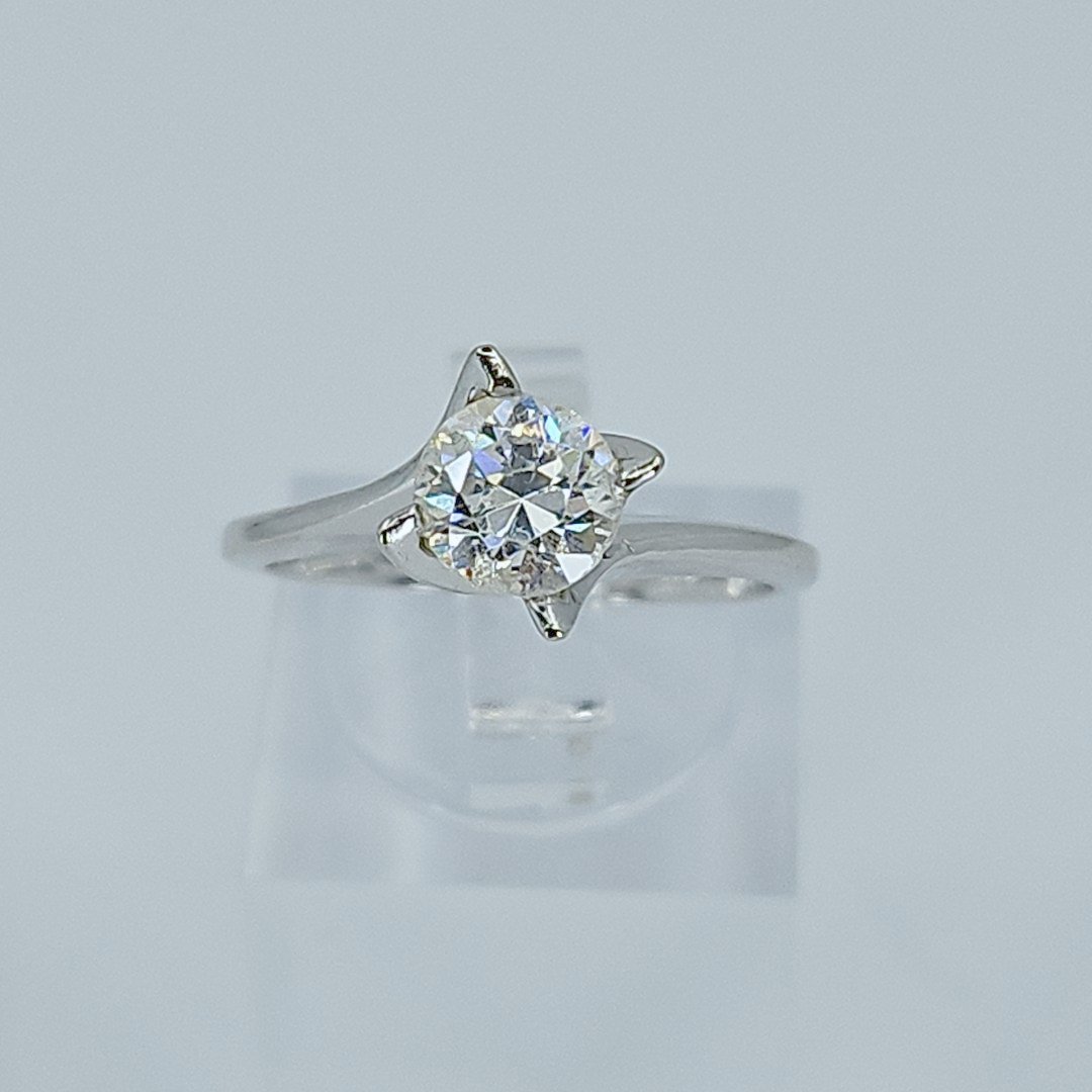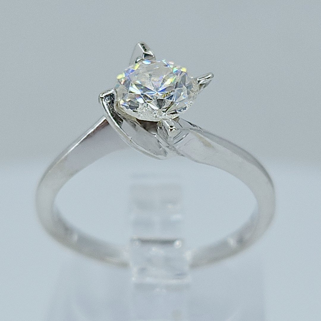 This beautiful ring features a sophisticated 14k white gold band, adorned with a striking white quartz gemstone. The gem is in a solitaire setting. The ring shows a maker’s mark of ’14k S’, verifying its authenticity and quality craftsmanship.