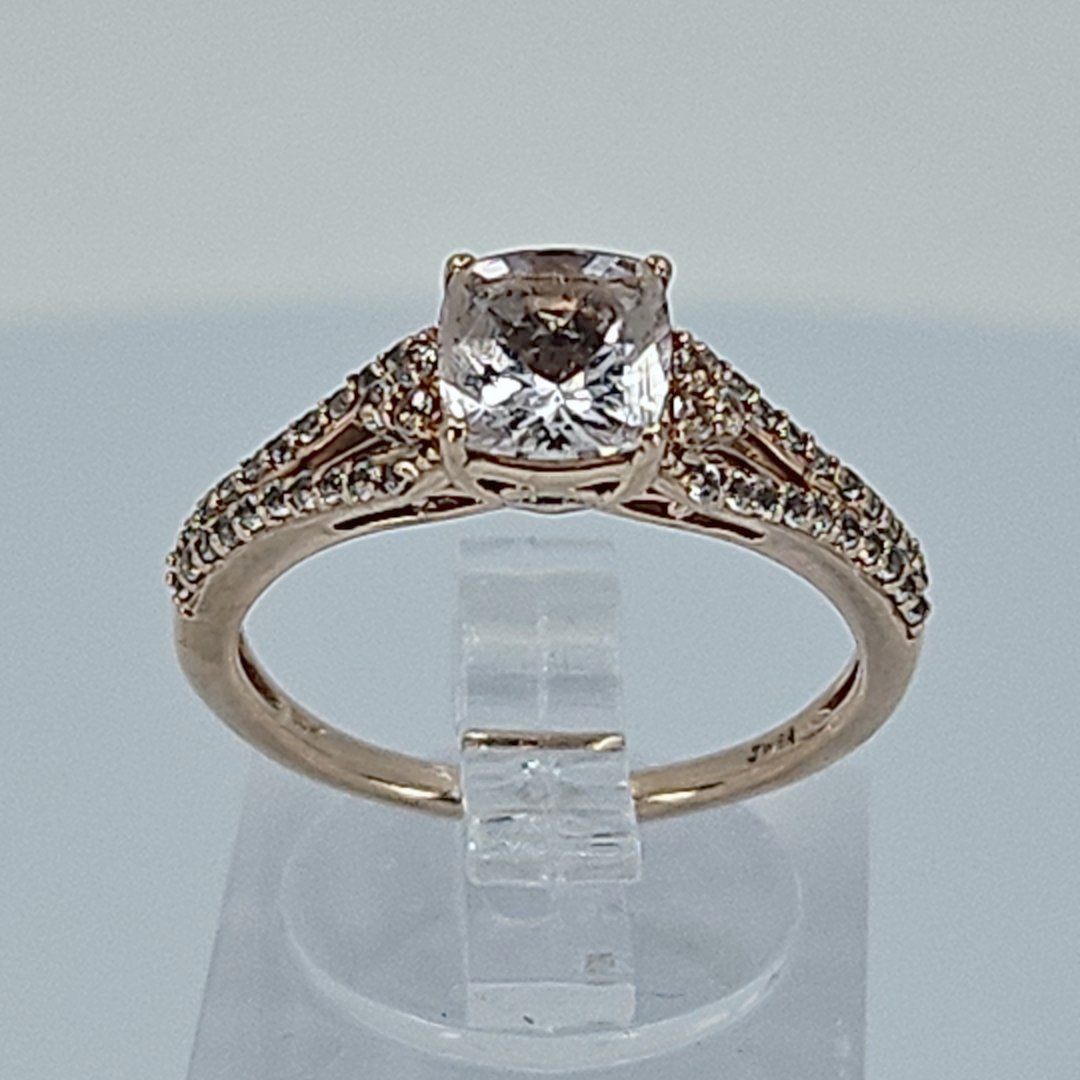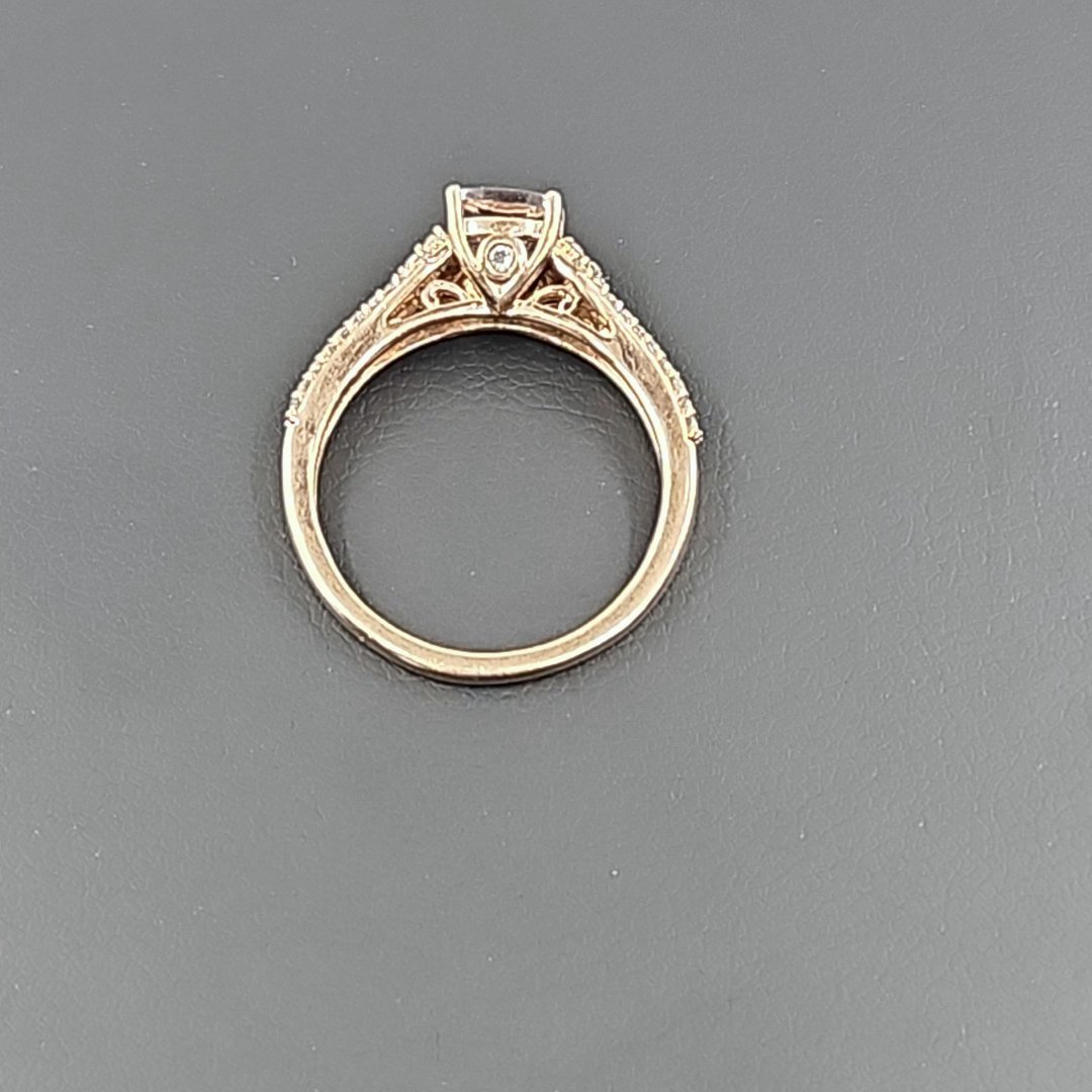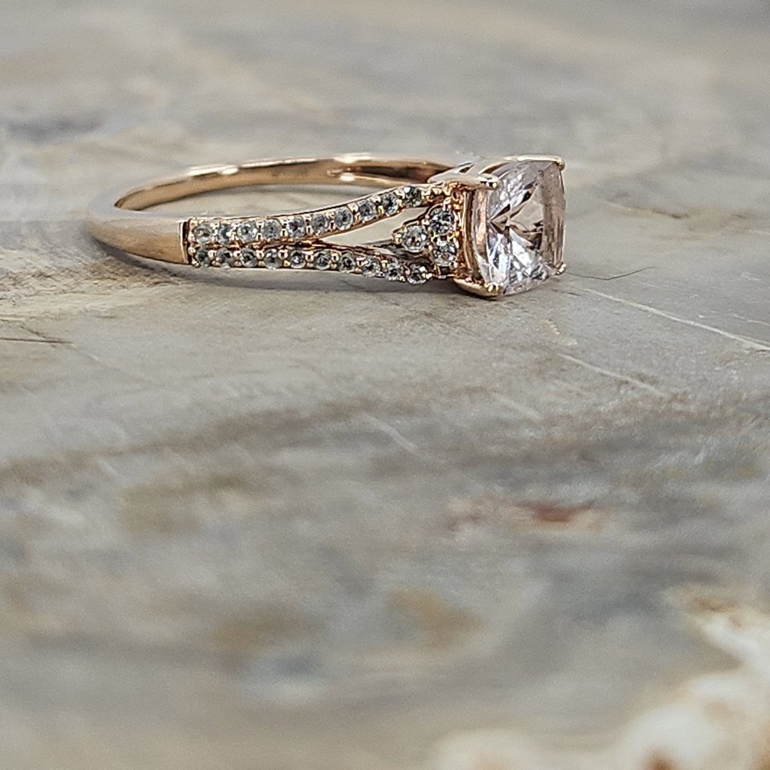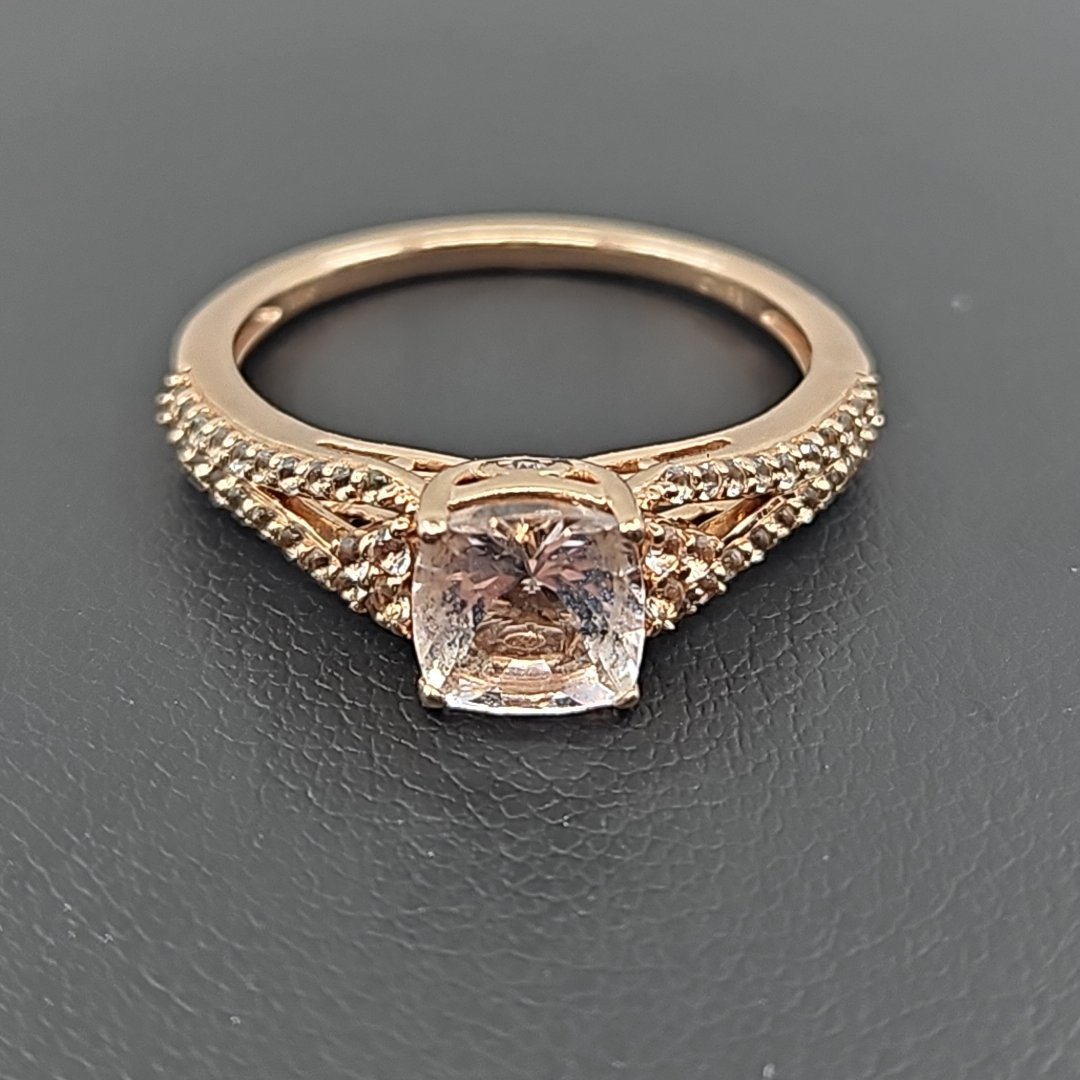 This refined rose gold ring features a beautifully centered morganite gemstone, complemented by intricate white topaz accents along the band for an elegant finish. The piece is polished to a high sheen, highlighting the quality and craftsmanship of the ring.