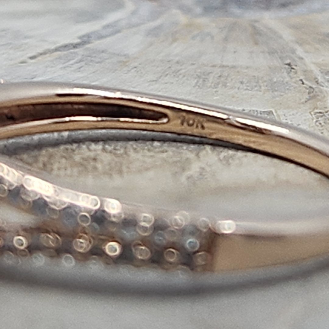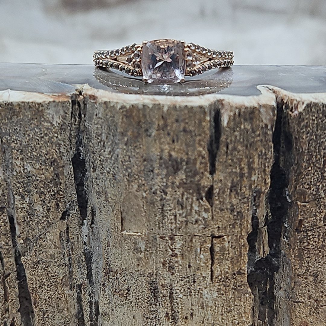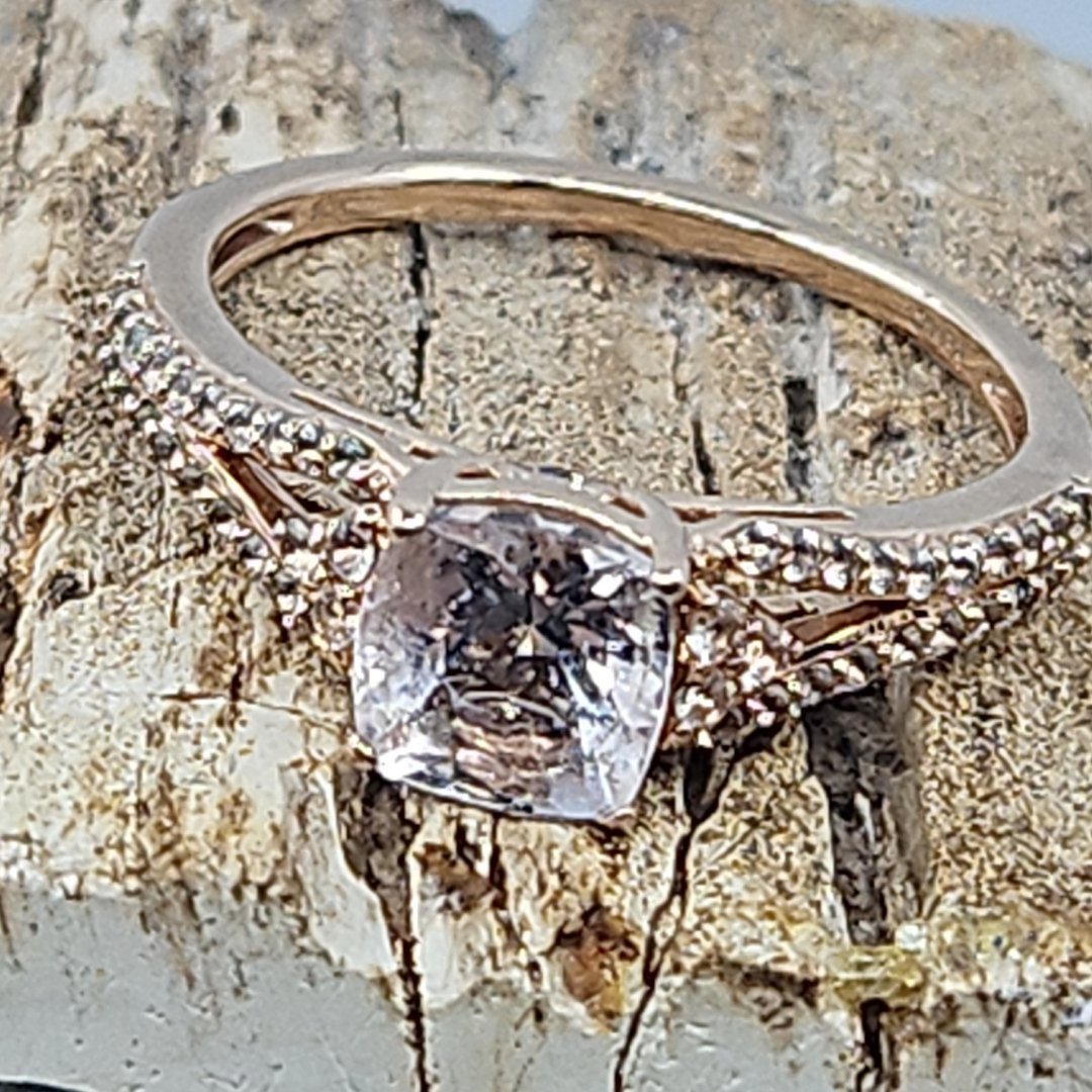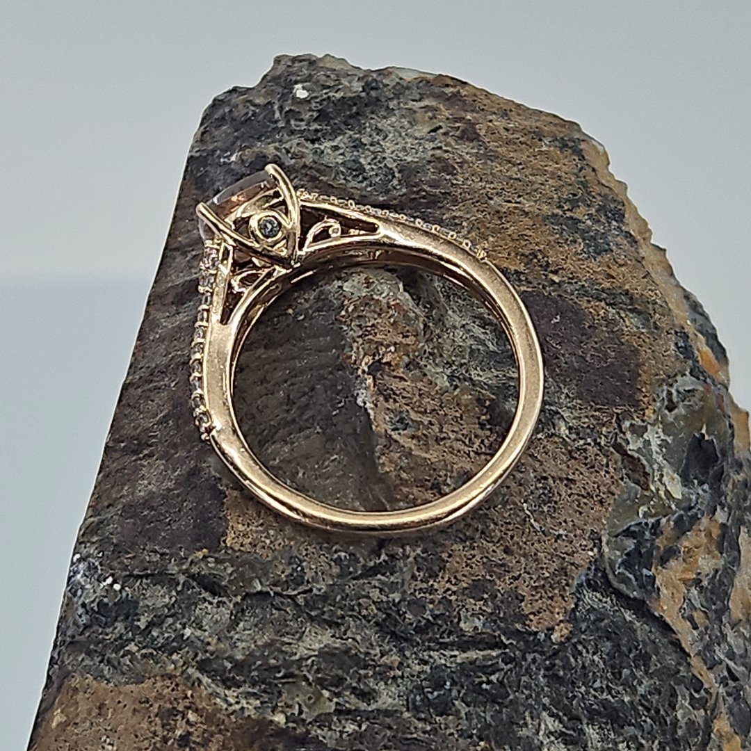 This refined rose gold ring features a beautifully centered morganite gemstone, complemented by intricate white topaz accents along the band for an elegant finish. The piece is polished to a high sheen, highlighting the quality and craftsmanship of the ring.
