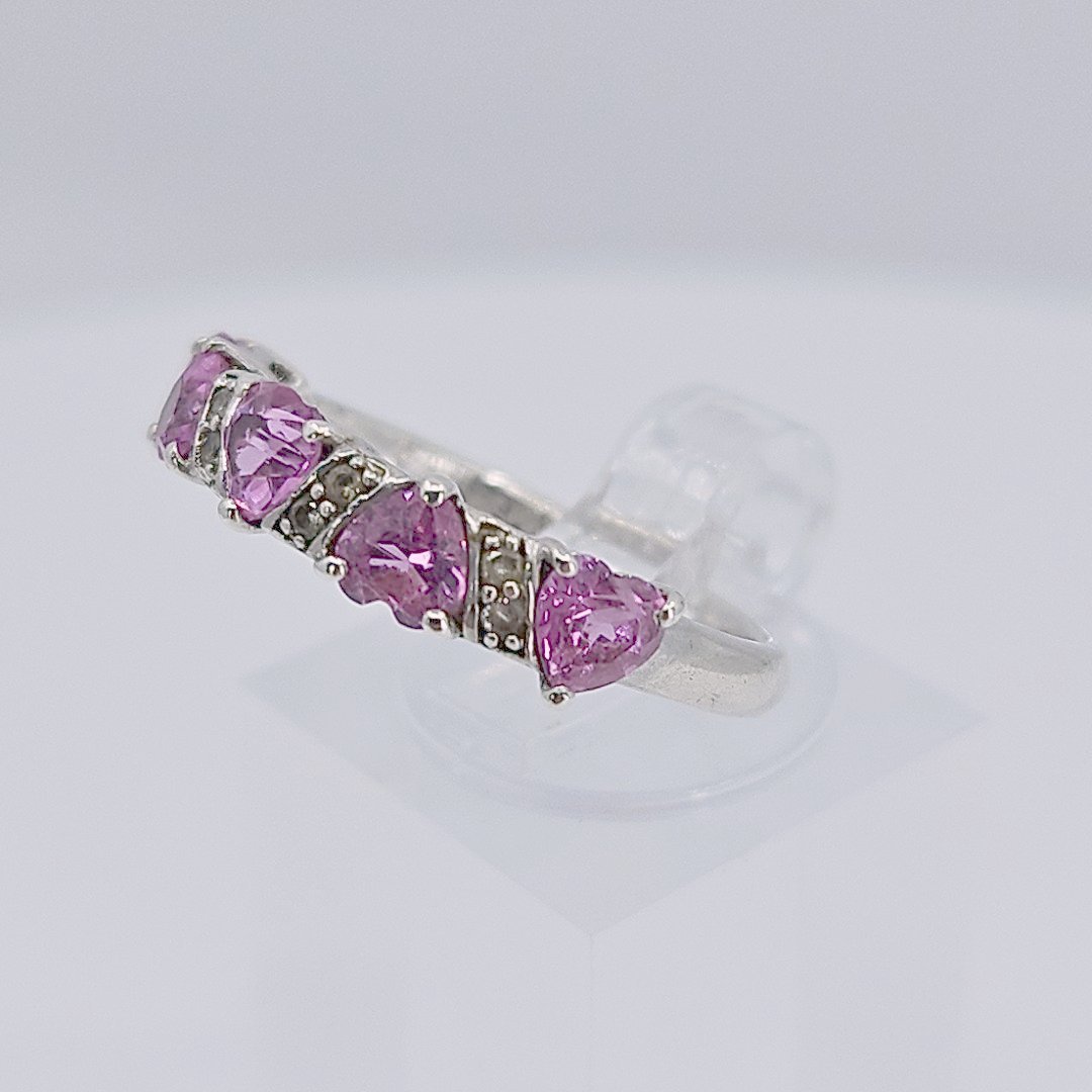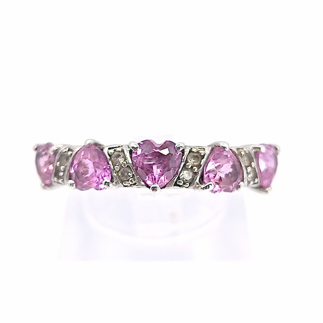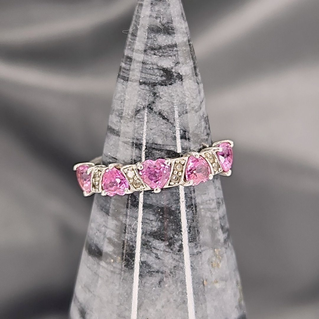 Great for Valentine’s Day! Beautiful pink sapphire ring with 5 hearts and 8 round diamonds. 925 silver Size 6.75.