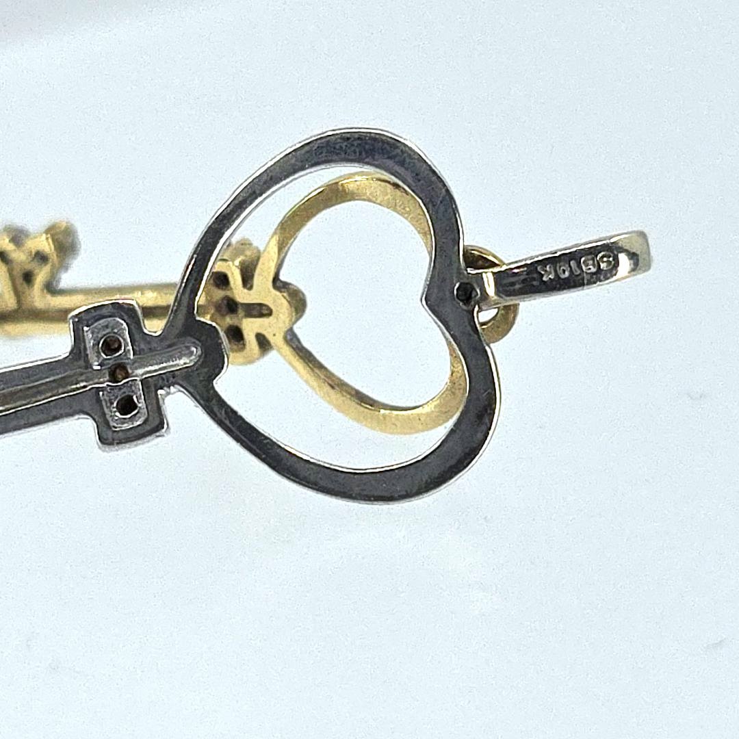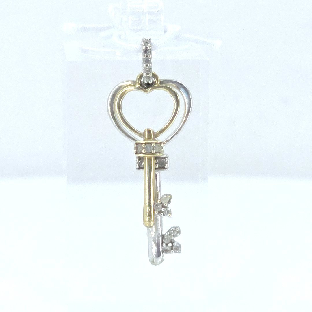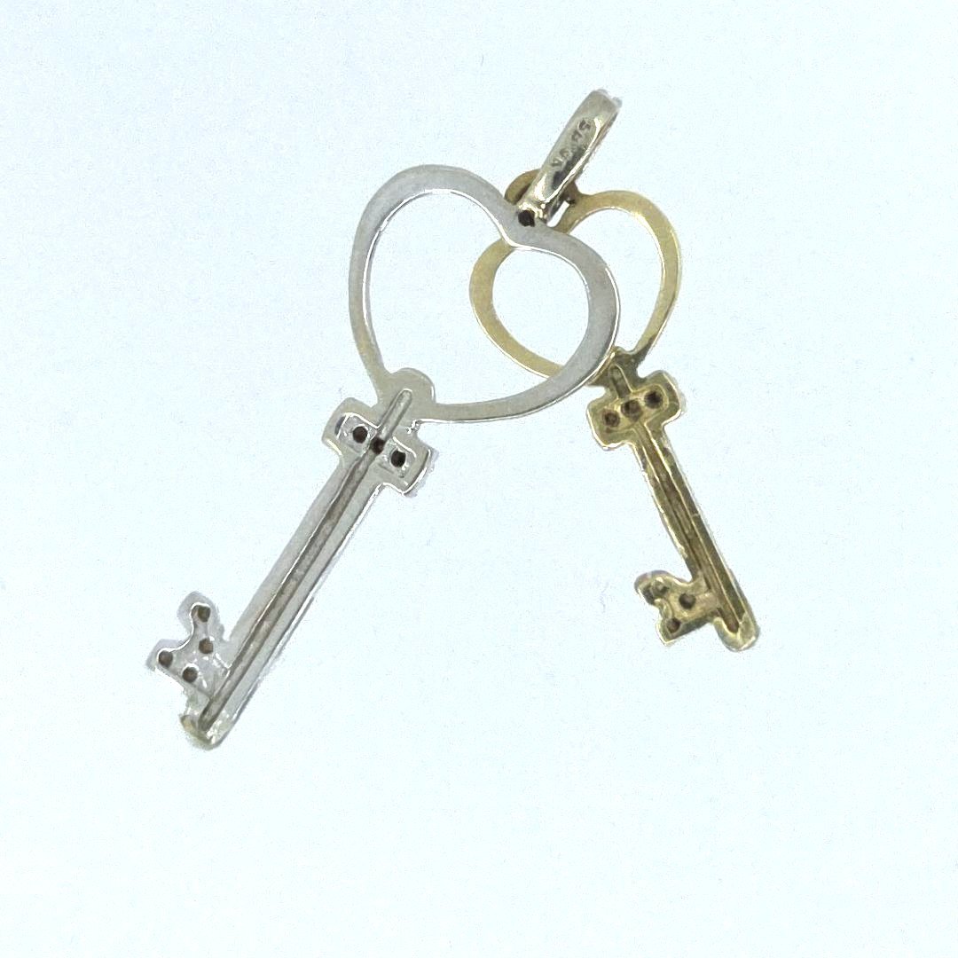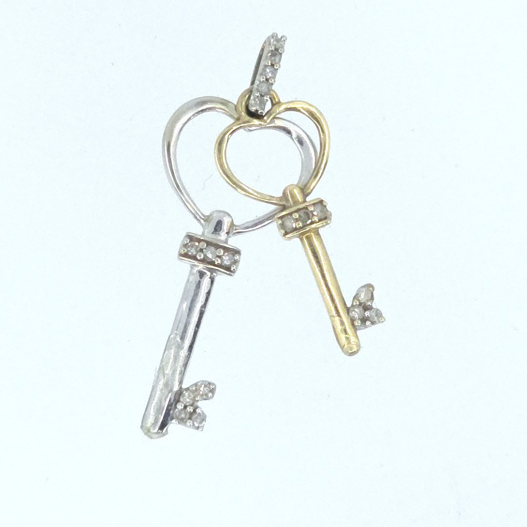 Unlock your style with this exquisite duo-tone gold and diamond pendant, artfully designed in the shape of two skeleton keys with hearts. Crafted with one white gold and one yellow gold key, this captivating piece boasts glimmering diamonds that enhance its timeless charm. Weighing a delicate 1.2 grams and stamped “SB 10K,” this pendant seamlessly blends elegance and modernity, making it a perfect accessory for any occasion.