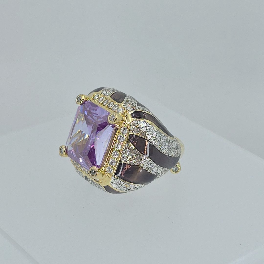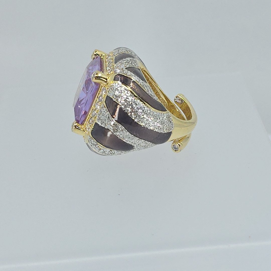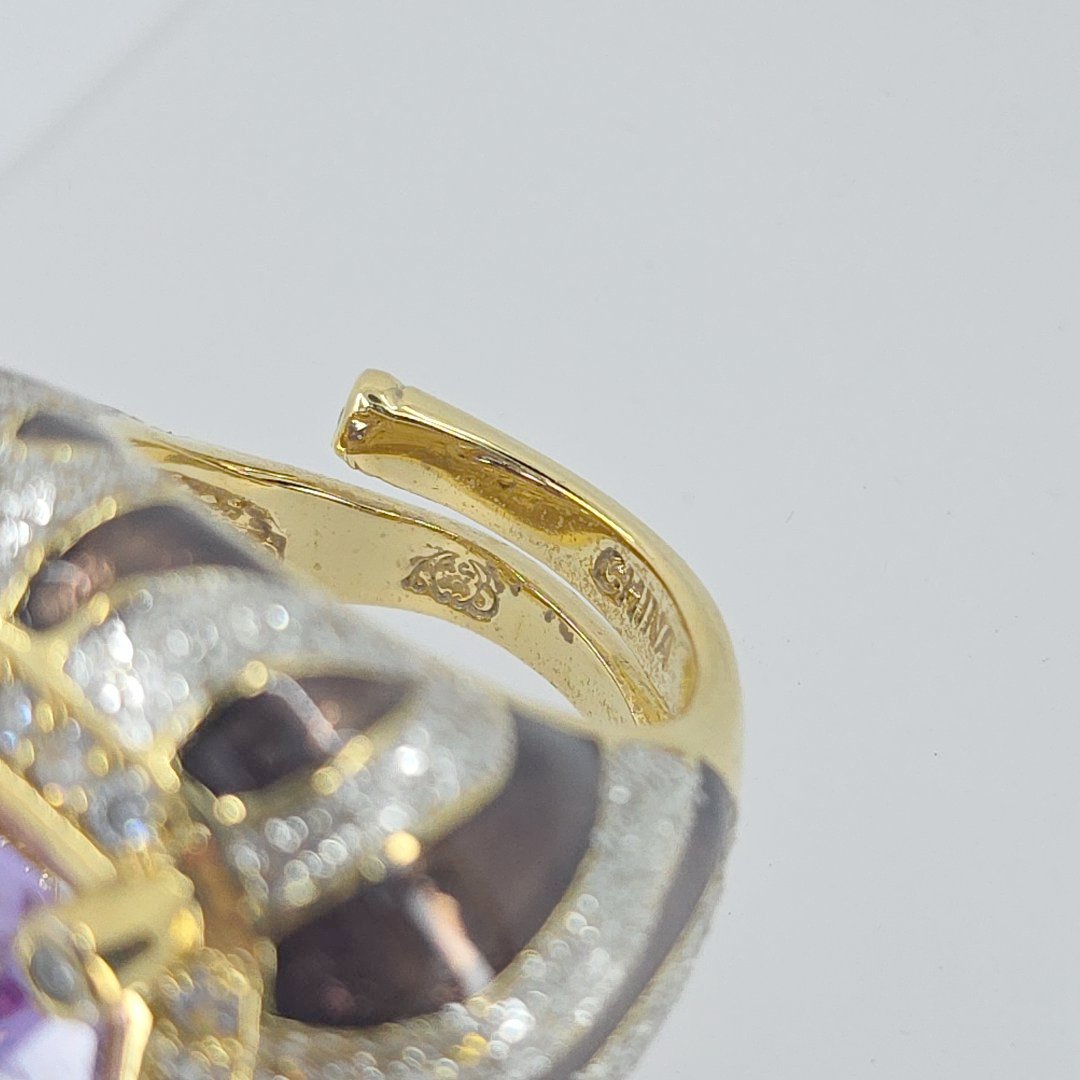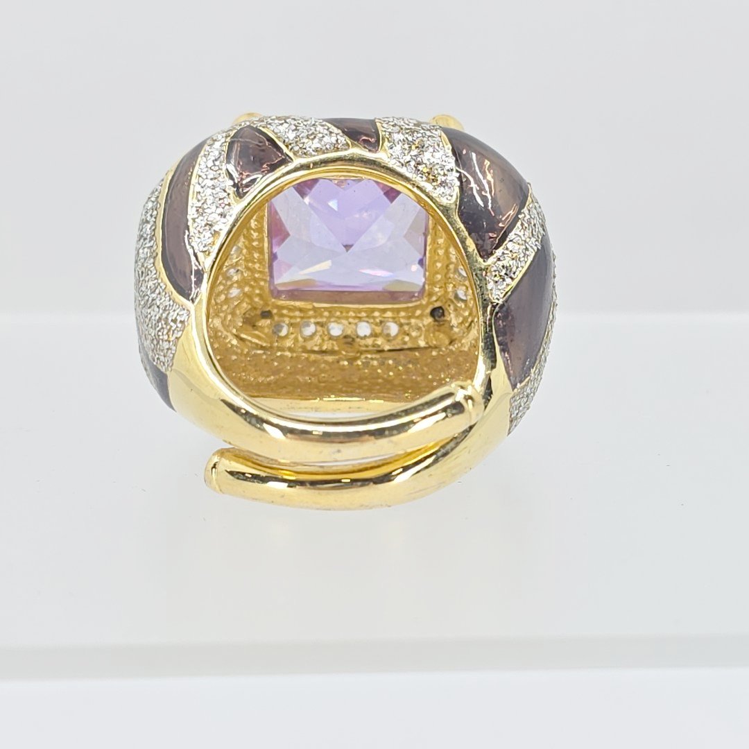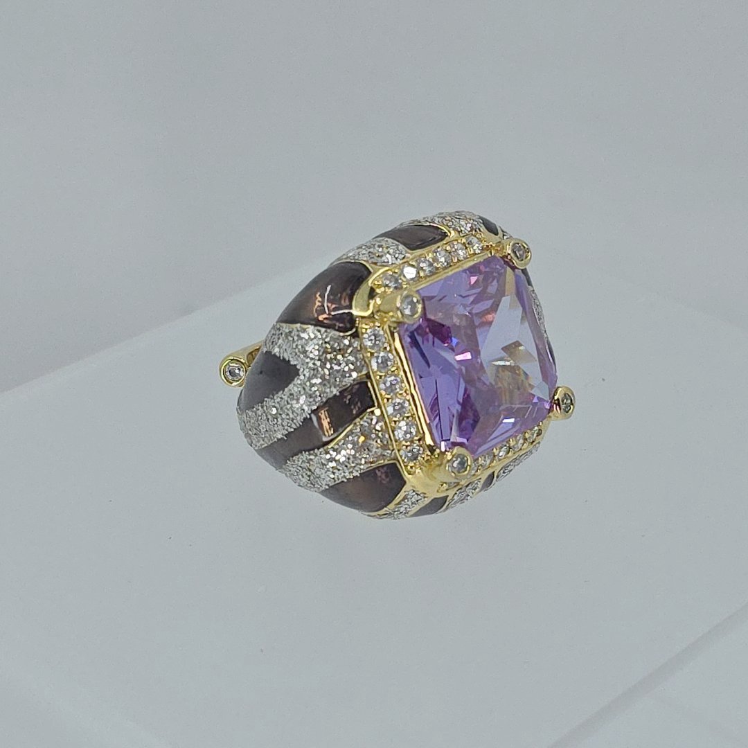 Elevate your elegance with the Princess Amanda Borghese Gold Tone Simulated Amethyst Stone, CZ, and Enamel Statement Ring, a stunning addition to any jewelry collection. Weighing an impressive 28.3 grams and designed in a size 9.25, this exquisite ring features a vibrant simulated amethyst centerpiece that radiates beauty. The dazzling cubic zirconia accents enhance the brilliance, while the intricate enamel detailing adds a touch of sophistication. Perfect for formal occasions or as an everyday statement piece, this ring seamlessly blends contemporary style with timeless charm.