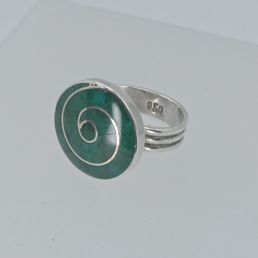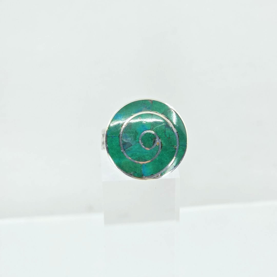 Introducing the stunning Green Chrysocolla Silver Spiral Pachamama Adjustable Ring, a unique piece that combines natural beauty with thoughtful craftsmanship. Designed with a size 7.5 fit, this ring weighs 7.4 grams, making it both lightweight and comfortable for everyday wear. The captivating green chrysocolla stone exhibits vibrant hues and intricate patterns, embodying the essence of harmony and balance.