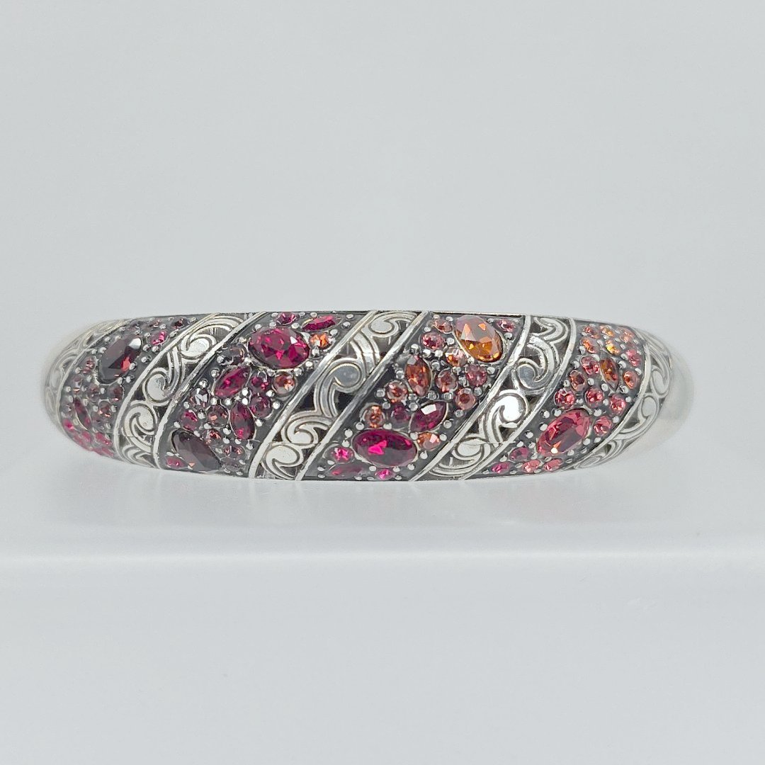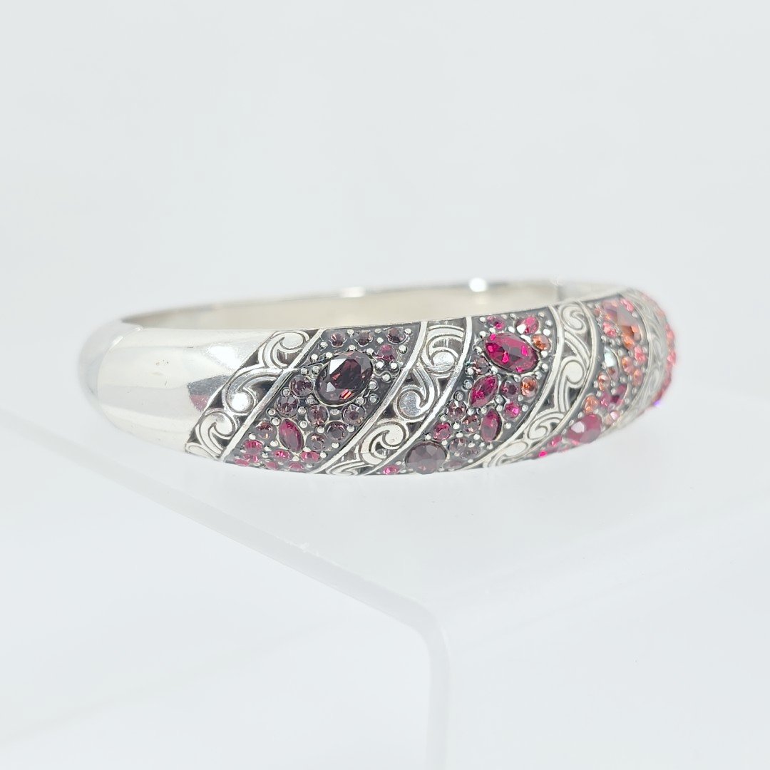 Elevate your accessory game with the Brighton Silver Tone Red Crystal Hinged Bangle Bracelet. Measuring 8.5 inches and weighing a delicate 51.9 grams, this stunning piece is designed for both elegance and comfort. The vibrant red crystals set against a gleaming silver tone create a striking contrast, perfect for adding a pop of color to any outfit.