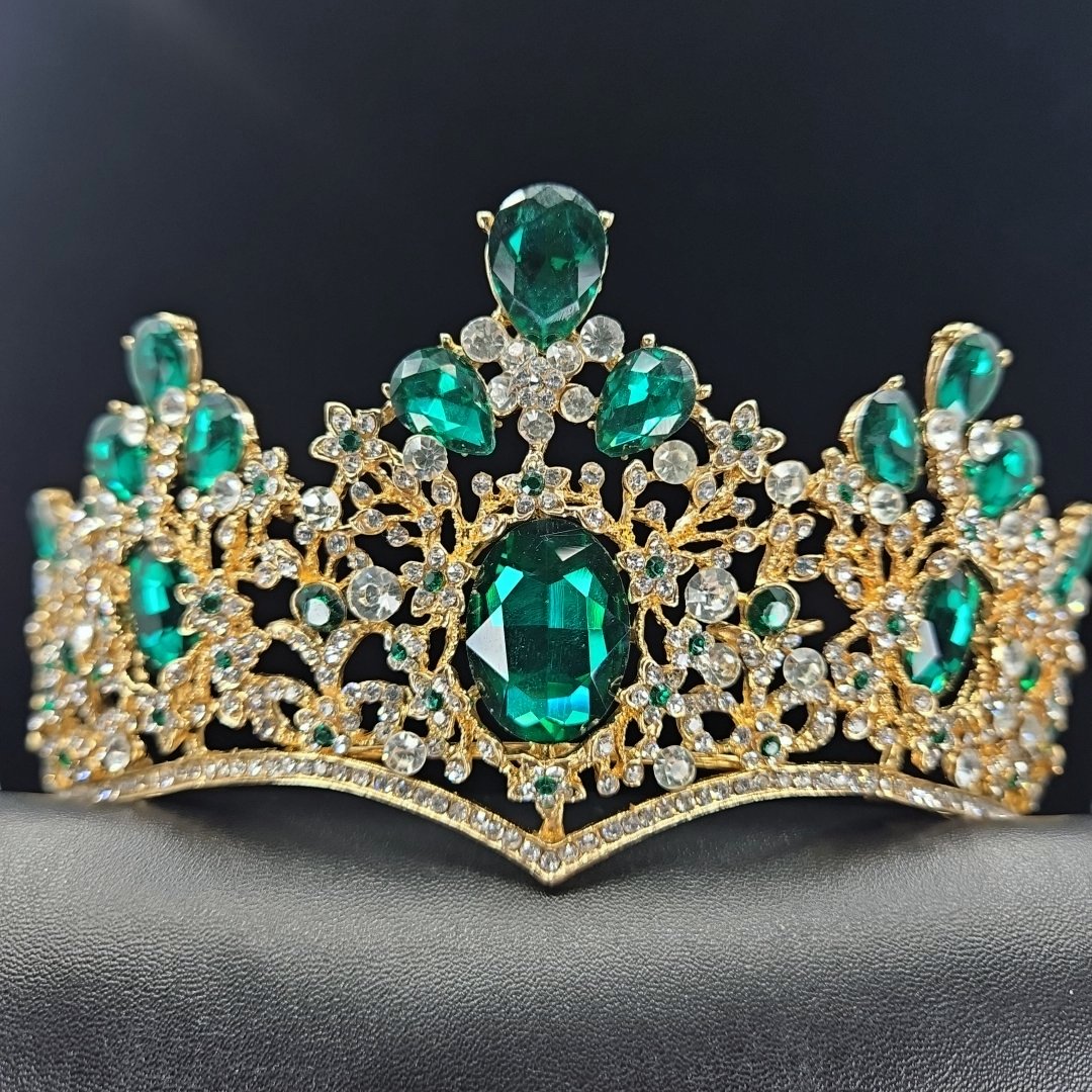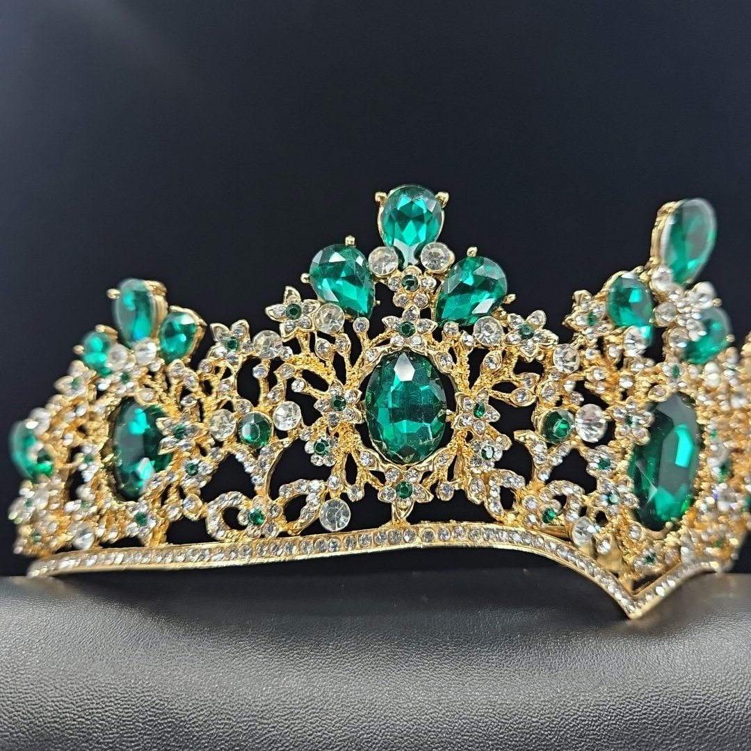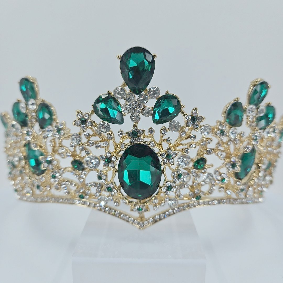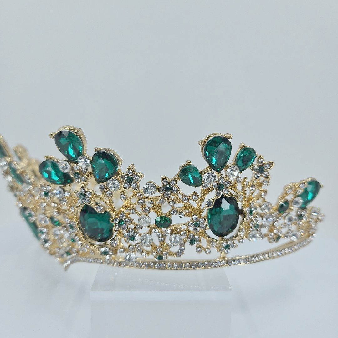 Embrace the timeless beauty of this exquisite tiara, adorned with shimmering green and white accents that capture the light with every movement. The delicate details and intricate design make it a stand-out piece that will elevate any ensemble.