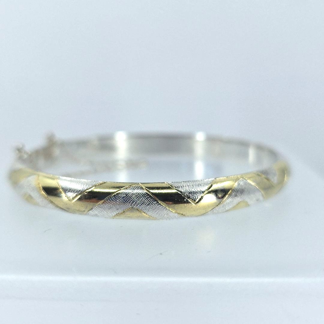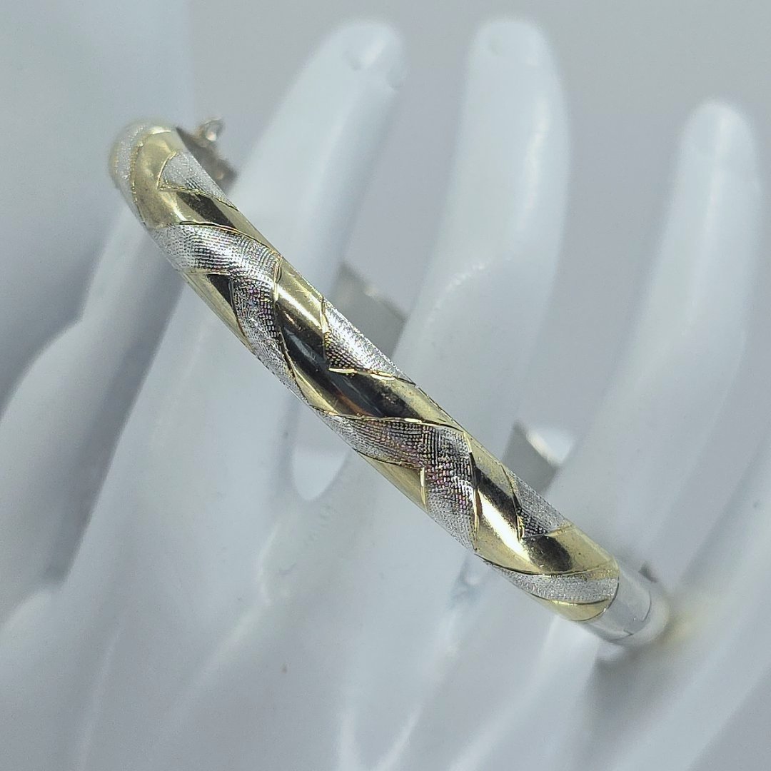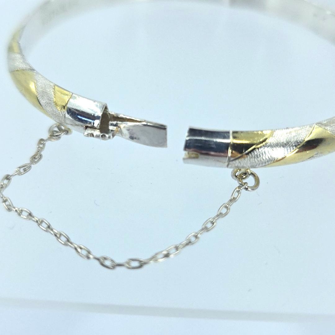 Elevate your accessory collection with this exquisite sterling silver gold vermeil bangle bracelet, showcasing a seamless combination of elegance and style. Crafted with precision, the bracelet is stamped “925 Thailand,” ensuring its high-quality sterling silver composition. Weighing 8.9 grams, it offers a perfect balance of sturdiness and comfort, making it an ideal choice for daily wear or special occasions.