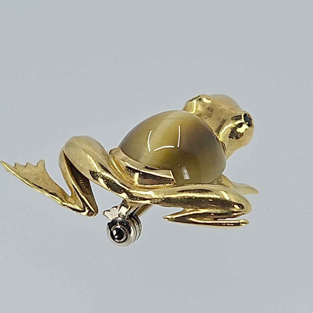 Here we have our amphibious friend making its debut, and oh boy, that tiger’s eye cabochon body—just look at it. Rich, golden-brown hues that ripple like sunlight across a lazy river. It’s polished to perfection, catching every glimmer of light and reflecting it back with a silky smoothness that practically purrs. And those sapphire eyes? Set delicately, but with intent. They don’t just sit there—they stare back at you, cool and confident, like the frog knows it’s the star of the show. The gold limbs are sculpted with precision—webbed feet poised mid-leap, as if it’s about to spring off your lapel and into the world.