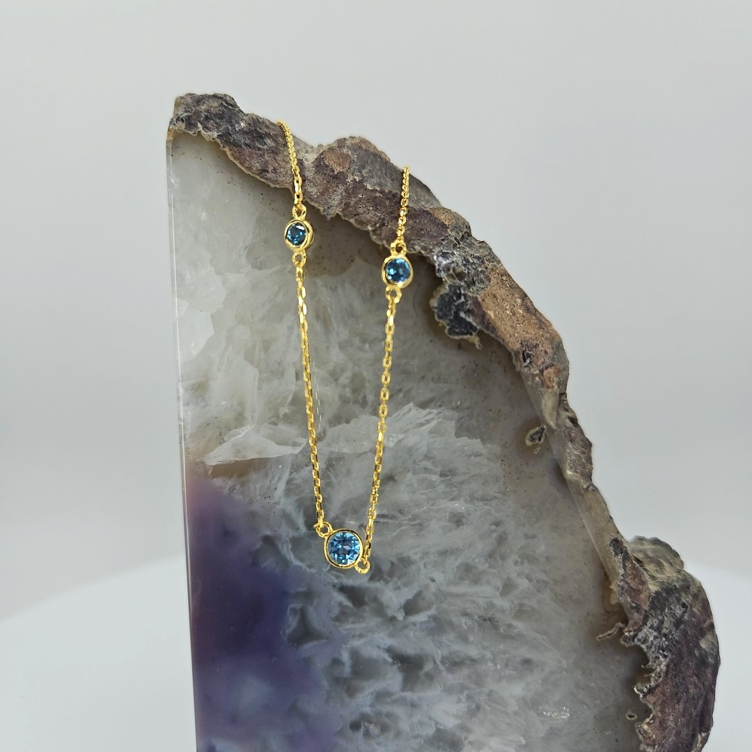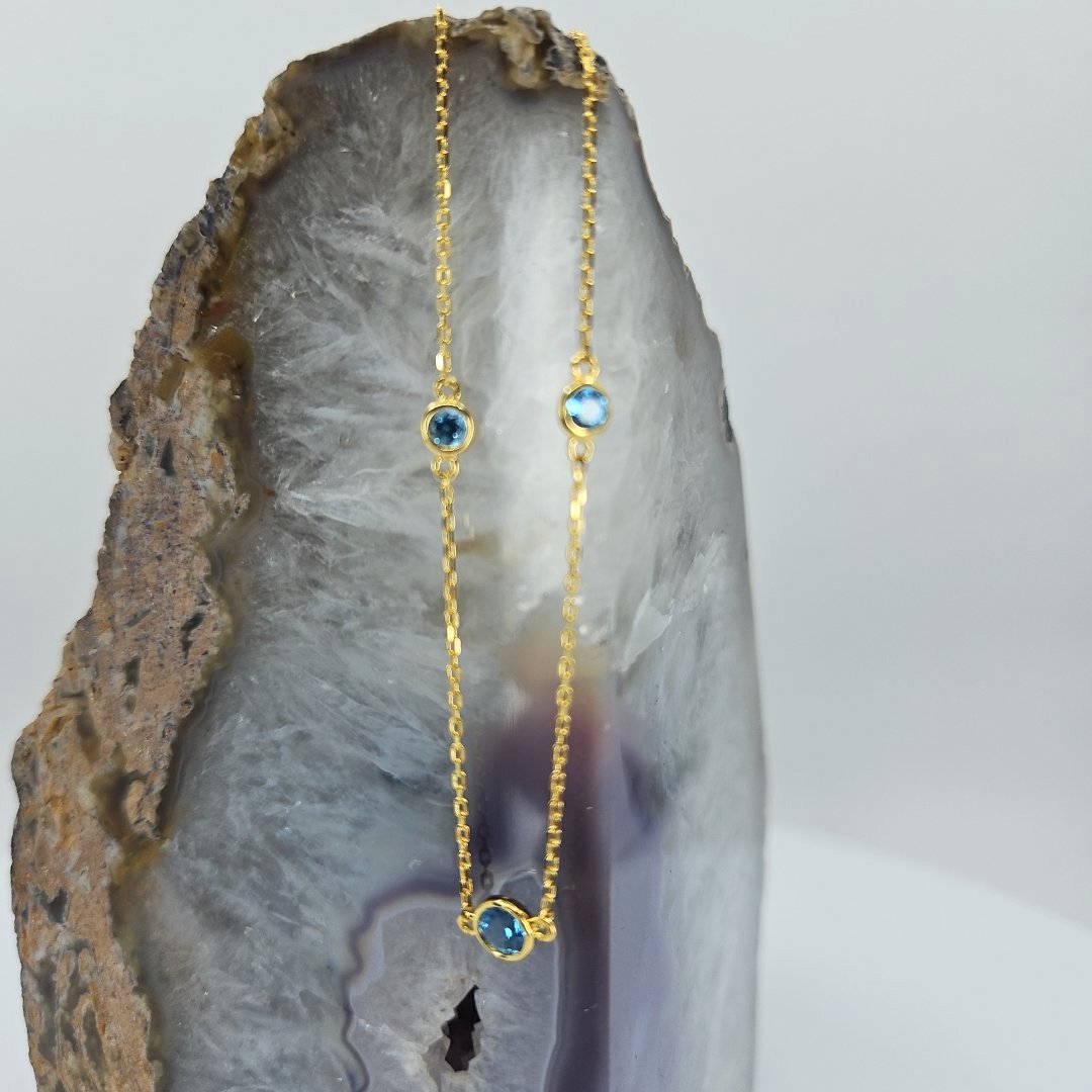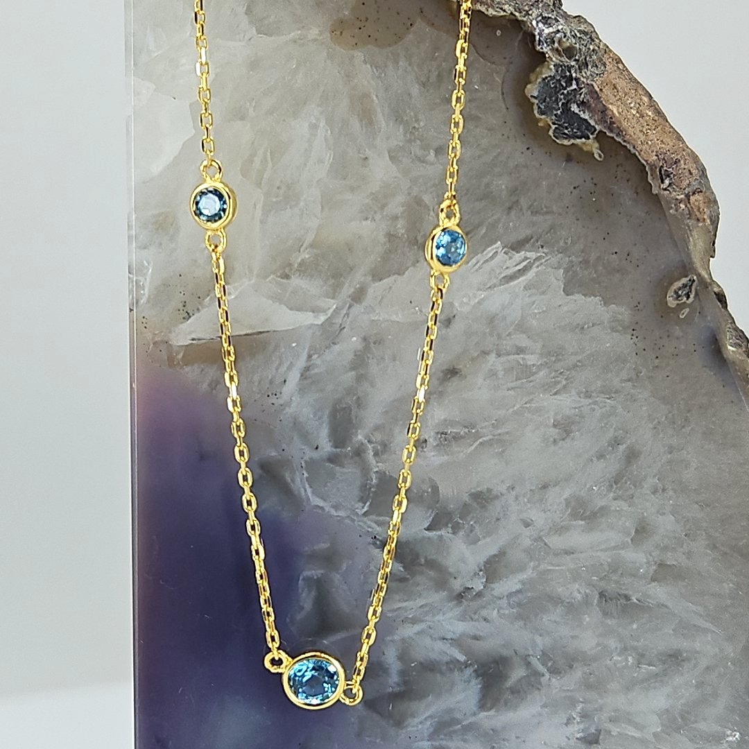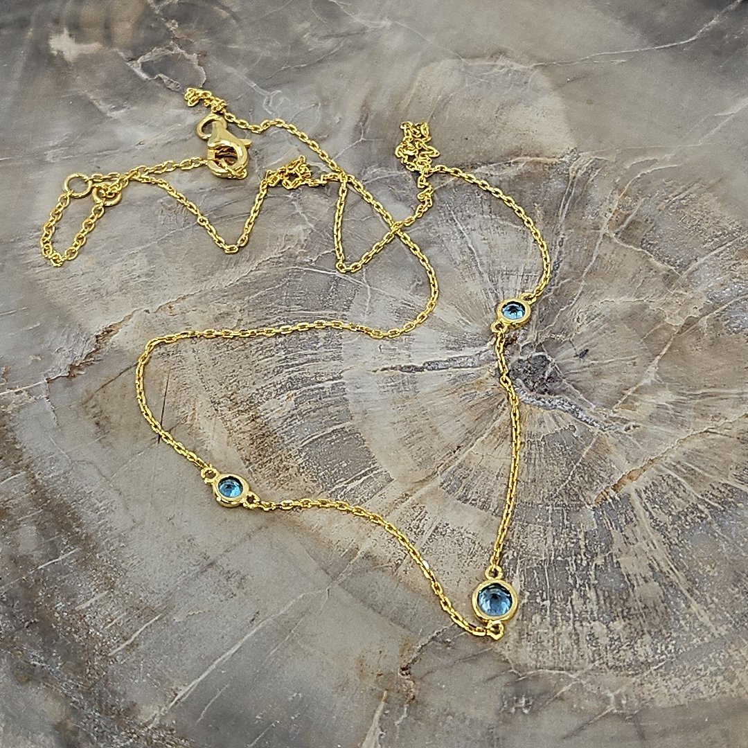 Join us in adding a touch of elegance to your wardrobe while making a difference with every purchase. Shop now and experience the beauty, craftsmanship, and individuality of our Vermeil Gold over Silver Blue Topaz Station Necklace from Tazzy’s Treasures.