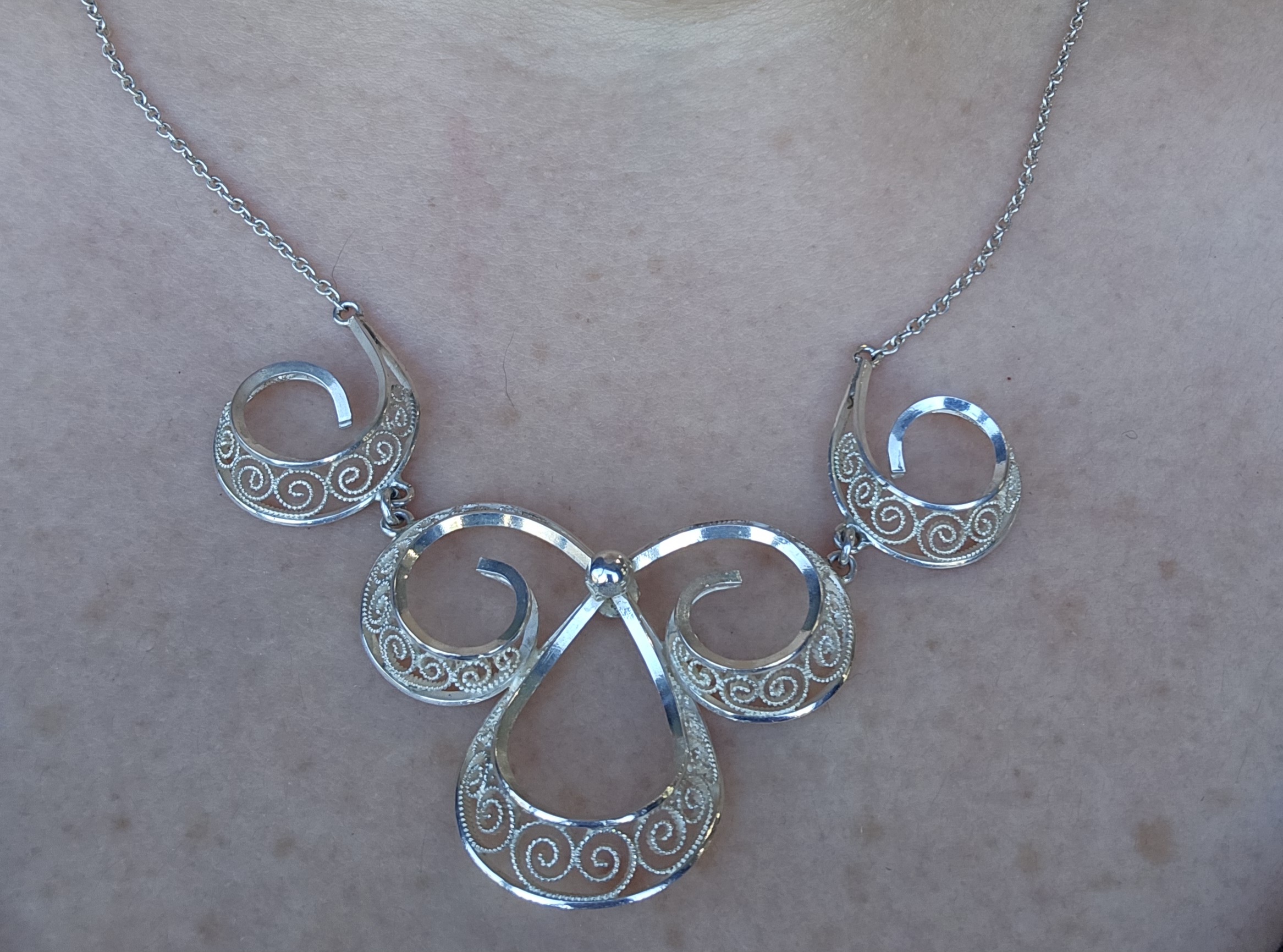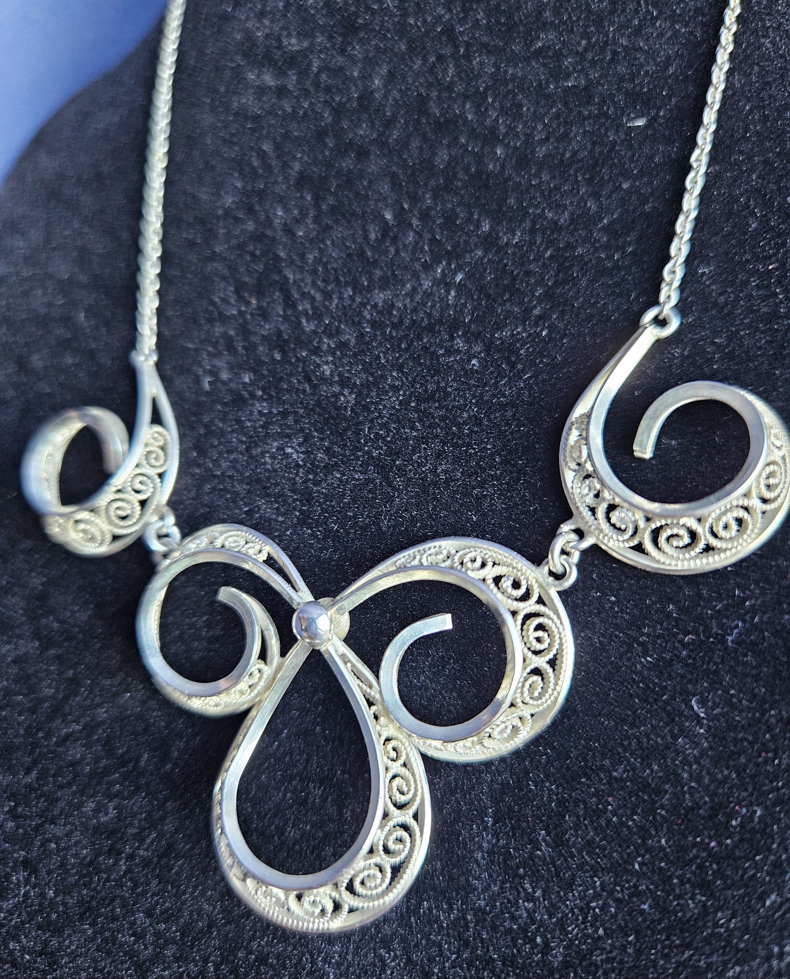 This exquisite vintage necklace by designer N.A. Jorgensen features a detailed filigree pendant crafted from 925 sterling silver. The intricate design and craftsmanship highlight the pendant’s elegant curves and swirls, offering a timeless piece of jewelry. The necklace is ideal for those who appreciate vintage aesthetics and the art of traditional silversmithing.